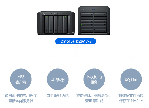 由此,網(wǎng)格化管理不僅需要一套操作簡便、兼容性廣泛的應(yīng)用系統(tǒng),同時服務(wù)器還要能夠承受文件頻繁創(chuàng)建、修改,并且還需要應(yīng)對可能出現(xiàn)的服務(wù)器高流量,借助平臺實現(xiàn)高可用,并且與本地的內(nèi)網(wǎng)系統(tǒng)實現(xiàn)集成。基于以上應(yīng)用需求,群暉制定了 NAS 文件服務(wù) + Node.js 數(shù)據(jù)庫服務(wù)( sqlite+socket )+ 綠色客戶端軟件的方案,架構(gòu)圖如下: