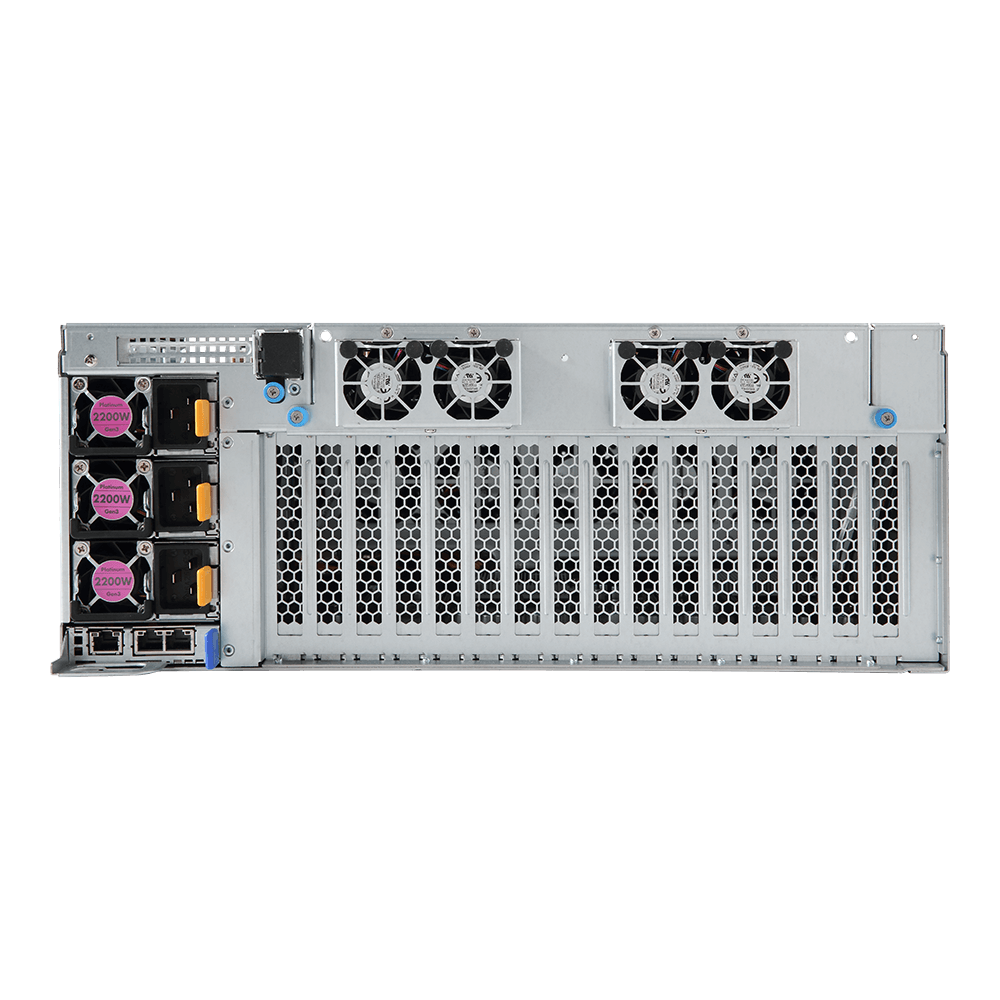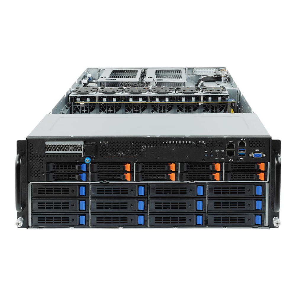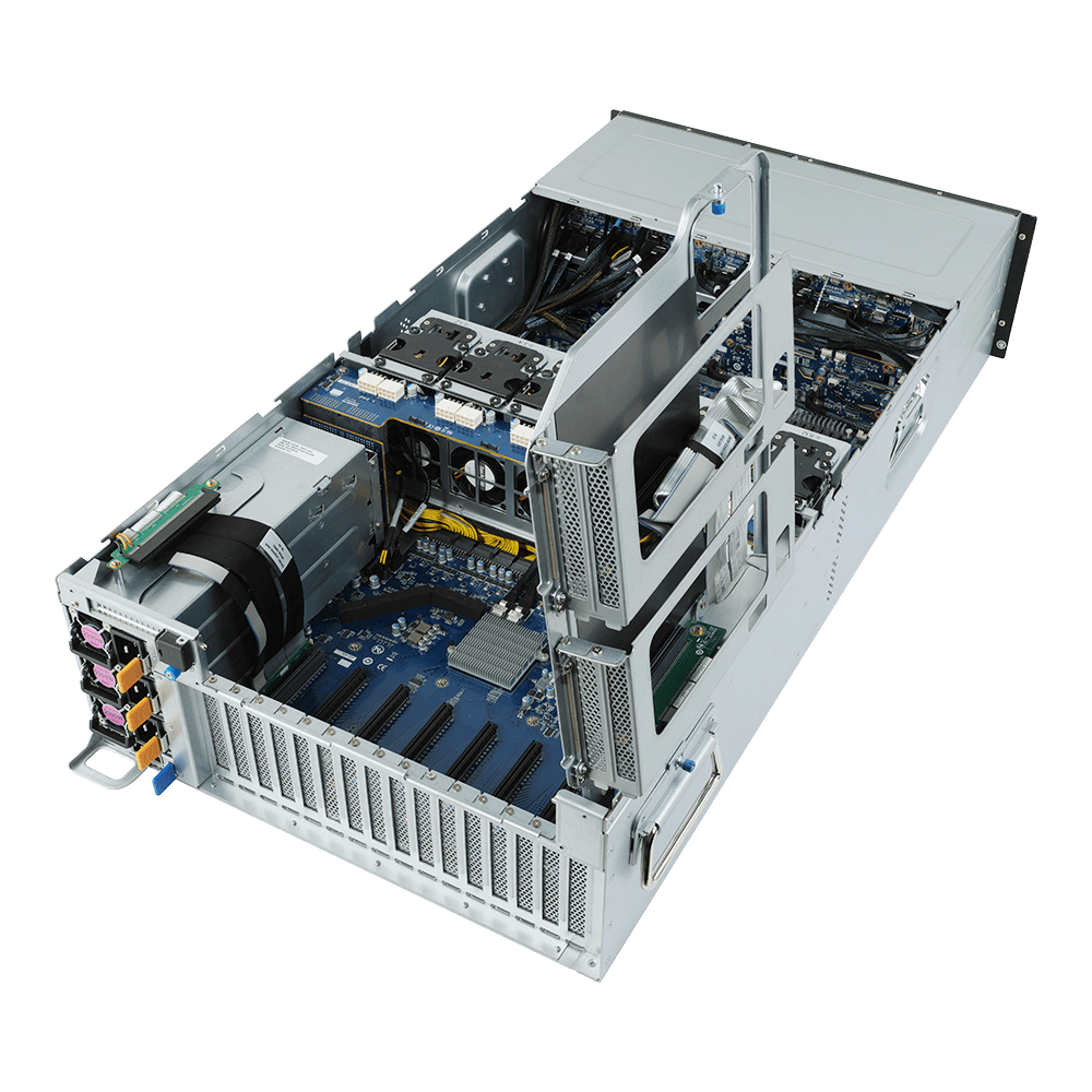 The G482-Z50 can support ten PCIe Gen 3.0 GPGPU cards in balanced mode, with each five GPU cards connected to one CPU downstream via a PCIe switch to minimize GPU to GPU communication latency.