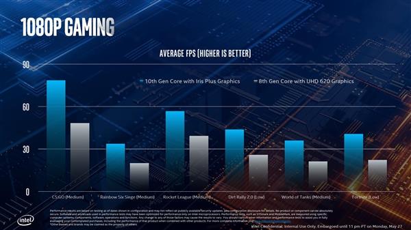 EU單元規(guī)模及先進(jìn)技術(shù)的加入,使得Gen11核顯的游戲性能比前代翻倍,48/64單元的Iris Plus核顯可以保證多數(shù)游戲大作的平均幀率超過(guò)30FPS,部分還能突破60FPS,完全可以保證大部分游戲中的流暢體驗(yàn)。