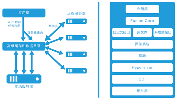 Matrix Fusion強(qiáng)大的靈活性來(lái)源于Fusion Core計(jì)算虛擬化引擎。Fusion Core控制應(yīng)用和基礎(chǔ)GPU計(jì)算之間的API調(diào)用指示,允許GPU負(fù)載靈活分布于本地GPU內(nèi)存、網(wǎng)絡(luò)附加GPU、擴(kuò)展至高達(dá)64個(gè)GPU,提供強(qiáng)大的整體性能。