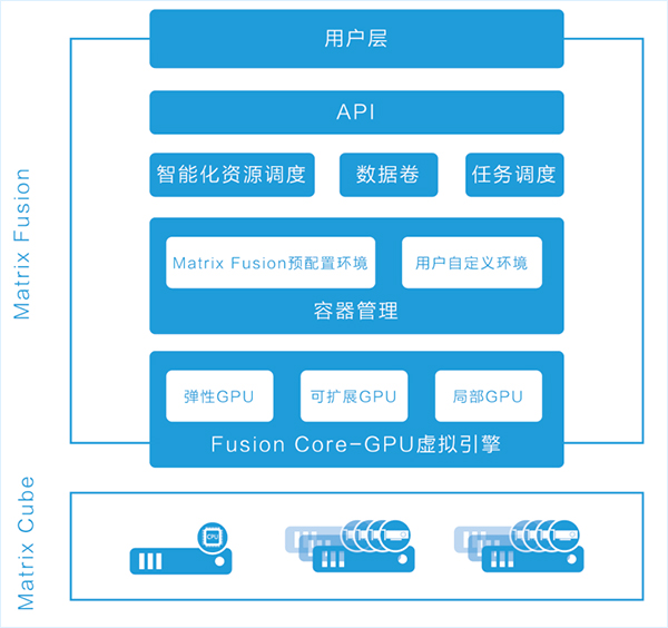 Matrix Fusion 支持各類(lèi)硬件及操作系統(tǒng),提供端到端的基礎(chǔ)設(shè)施軟件解決方案,管理基礎(chǔ)CPU和GPU計(jì)算資源,能夠自動(dòng)進(jìn)行工作負(fù)載資源調(diào)配。深度學(xué)習(xí)是同時(shí)利用CPU和GPU處理工作負(fù)載的典型應(yīng)用,Matrix Fusion通過(guò)整合用戶所有的硬件資源(集群亦或是單機(jī))成為CPU+GPU資源池,再將資源根據(jù)開(kāi)發(fā)者需要重新分配CPU和GPU到開(kāi)發(fā)者的虛擬環(huán)境下,管理員也可以將多余的計(jì)算資源靈活分配給其他用戶或更為嚴(yán)苛的工作負(fù)載。
