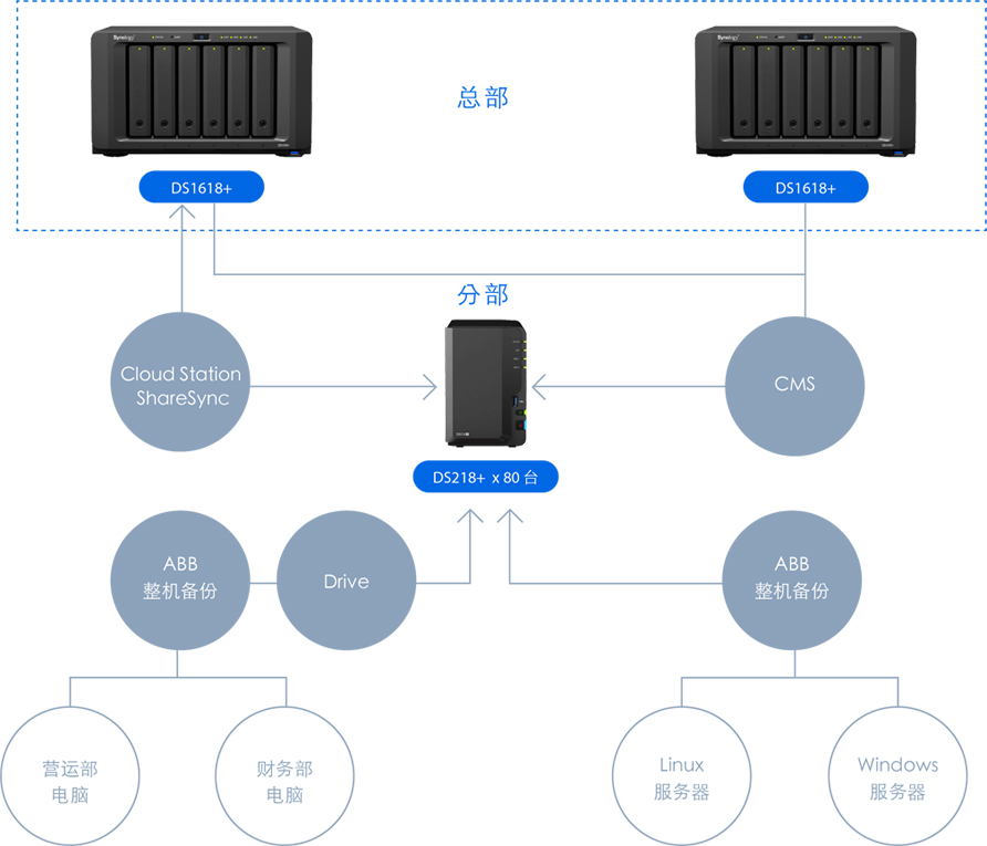 針對(duì)門(mén)店?duì)I運(yùn)部、財(cái)務(wù)部電腦里的重要文件,我們?yōu)殡娔X設(shè)置賬戶(hù)并進(jìn)行備份。先用 Drive 將辦公文件備份到分部的 NAS 上,然后再通過(guò) Cloud Station ShareSync ?將文件統(tǒng)一同步并歸檔到總部的 DS1618+ 上。想要管理眾多分部的 80 臺(tái) DS218+ 也很方便,我們可以在總部的 DS1618+ 上統(tǒng)一配置、監(jiān)控所有分部的數(shù)據(jù),并選擇性同步下發(fā)各項(xiàng)公文、通知。